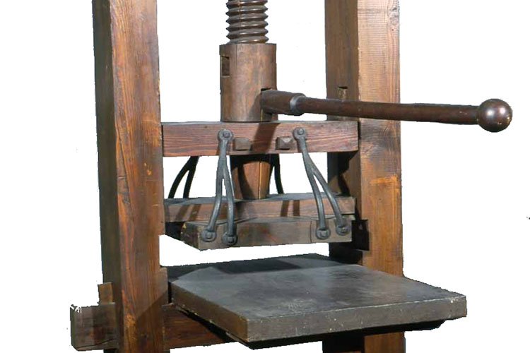Dettaglio della locandina: una vecchia macchina per la stampa