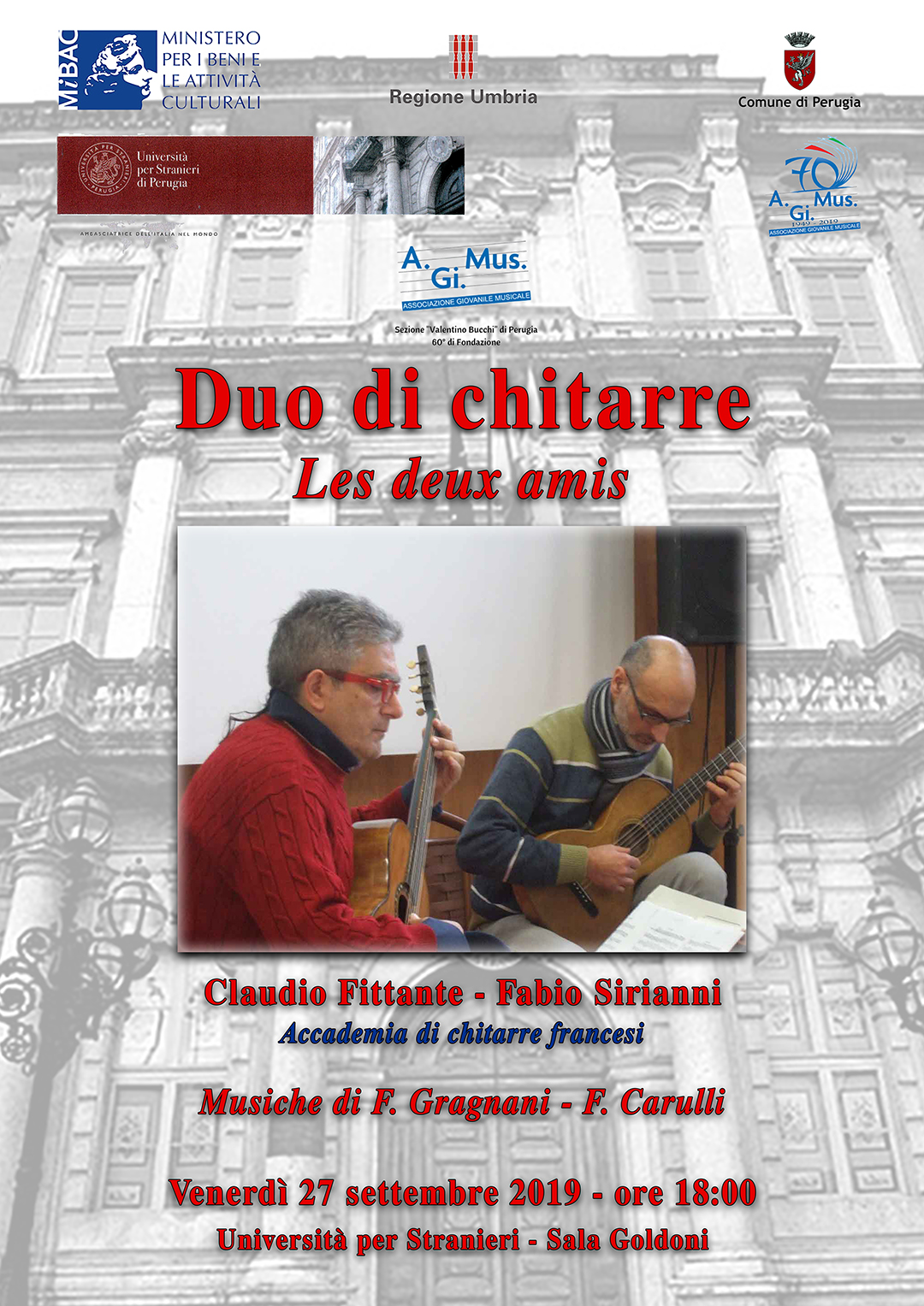 Concerto A.Gi.Mus. Venerdì, 27 settembre 2019 - 18:00Aula Magna di Palazzo Gallenga Locandina dell'evento Duo di chitarre: Claudio Frittante - Antonio Aprile Elenco generaleCEARC