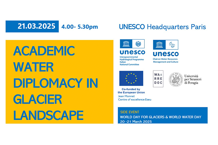 Nell'ambito delle celebrazioni della prima Giornata mondiale dei ghiacciai e della Giornata mondiale dell'acqua che si terranno a Parigi il 20 e il 21 marzo 2025, si svolgerà l'evento "Academic water diplomacy in glacier landscape", promosso da: UNESCO Intergovernmental Hydrological Programme Italian National Committee, UNESCO Chair on Water Resources Management and Culture dell'Università per Stranieri di Perugia, WARREDOC (Centro di Ricerca e Documentazione sulle Risorse Idriche) e Jean Monnet Centre of excellence Eseu.