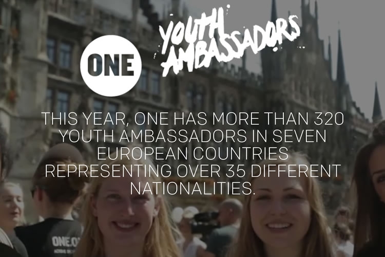 Gli Youth Ambassador sono giovani attivisti estremamente motivati che conducono attività di sensibilizzazione in tutta Europa per porre fine alla povertà estrema. Sollecitano un impegno concreto dei responsabili politici, lavorano con i mezzi di comunicazione per aumentare la visibilità delle campagne di ONE e incoraggiano il pubblico ad agire nella lotta contro la povertà con attività online ed eventi locali. Il programma è un'ottima opportunità per studenti appassionati di affari internazionali e cooperazione internazionale.