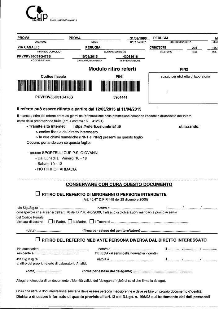 2. Il paziente al momento della prenotazione riceverà un foglio contente il codice fiscale e il PIN1. __________________________________________________________________________