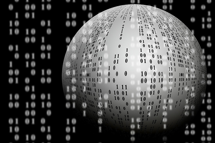 Dettaglio della locandina: sfera con successioni di numeri 0 e 1