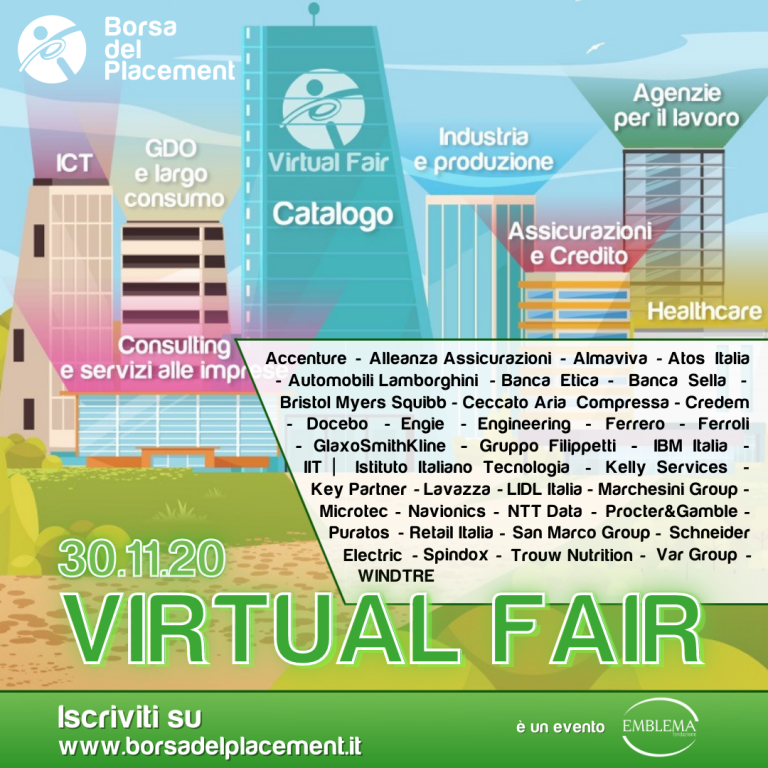 La Virtual Fair è in programma il 30 NOVEMBRE 2020 e vedrà la partecipazione di oltre 40 grandi aziende tra cui: Alleanza Assicurazioni, Automobili Lamborghini, Bristol Myers Squibb, Ferrero, IBM, GlaxoSmithKline, Lavazza, P&G, WindTre, Banca Sella, Spindox, Engie, Banca Etica, Accenture. Per i partecipanti: https://www.borsadelplacement.it/network