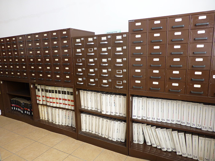Presso la sala lettura al 1° piano della Palazzina Valitutti, sono consultabili i cataloghi cartacei per autore-titolo e per soggetto che riportano le informazioni bibliografiche relative a tutto il patrimonio librario acquisito o donato dal 1927 fino al 1989.