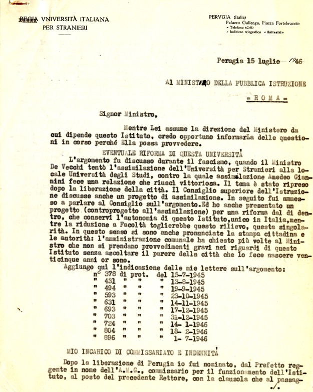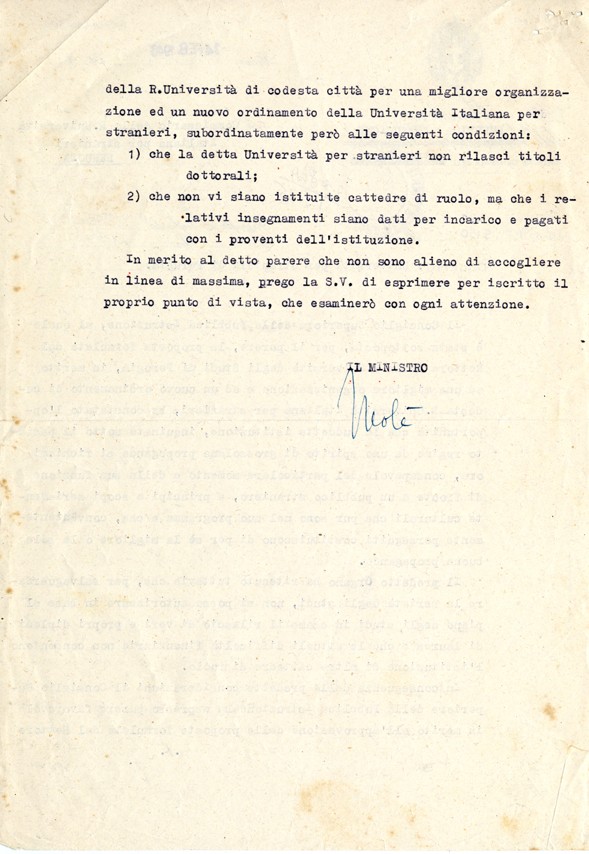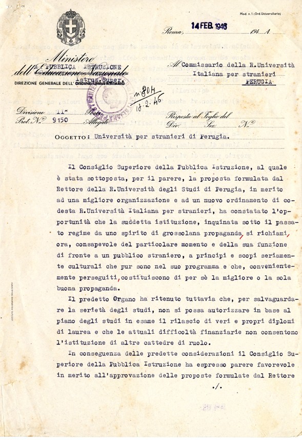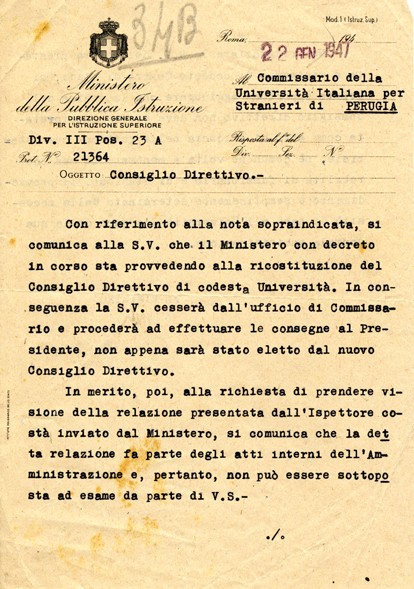 1. Lettera del ministro della pubblica istruzione Enrico Molè al commissario della regia Università italiana per Stranieri riguardante il riordinamento dell’istituzione, Roma, 14 febbraio 1946 - pag.1, pag.2