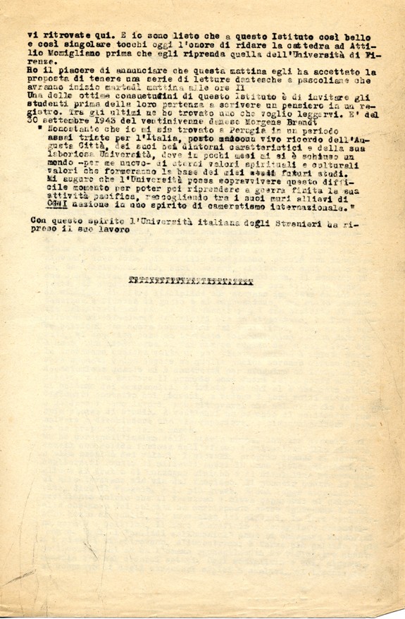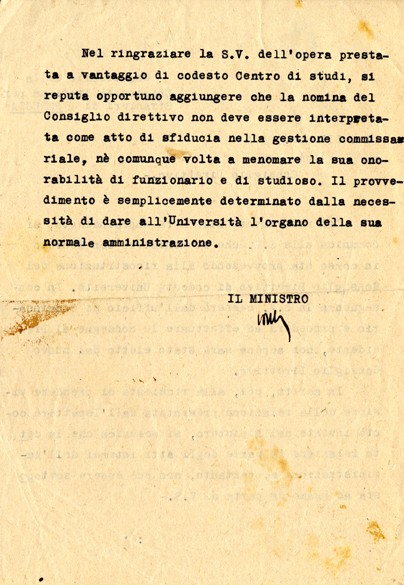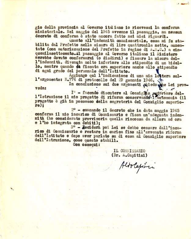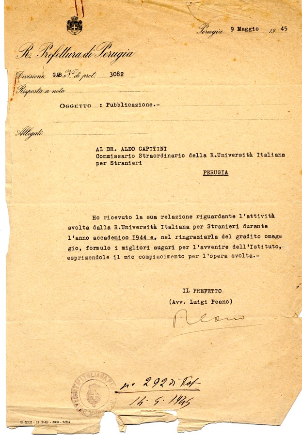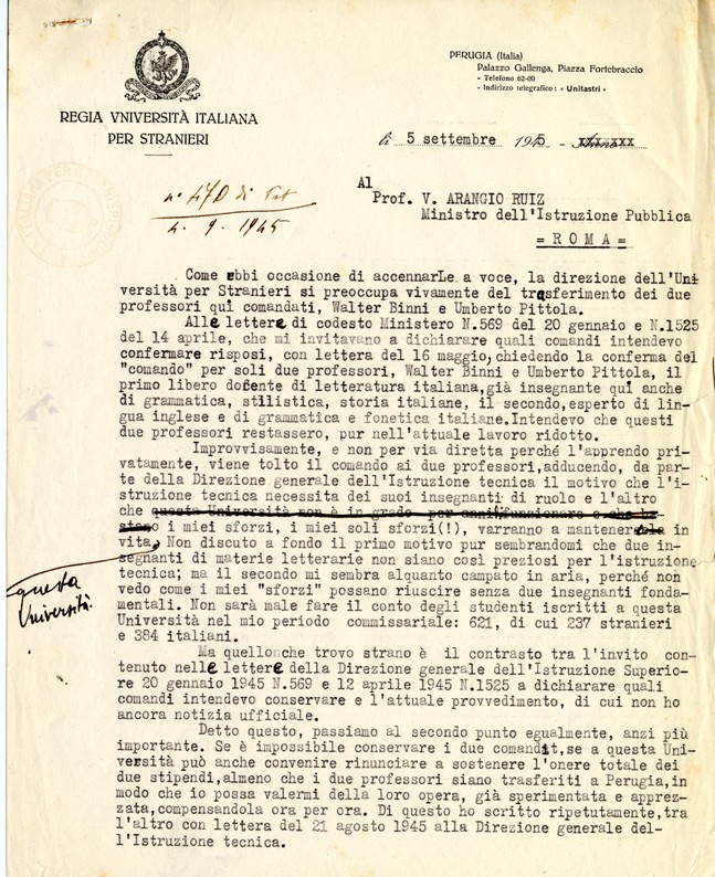 1. Lettera del ministro dell’istruzione Vincenzo Arangio Ruiz al commissario Aldo Capitini relativa all’invito a visitare e tenere una lezione all’Università italiana per Stranieri, Roma, 17 marzo 1945