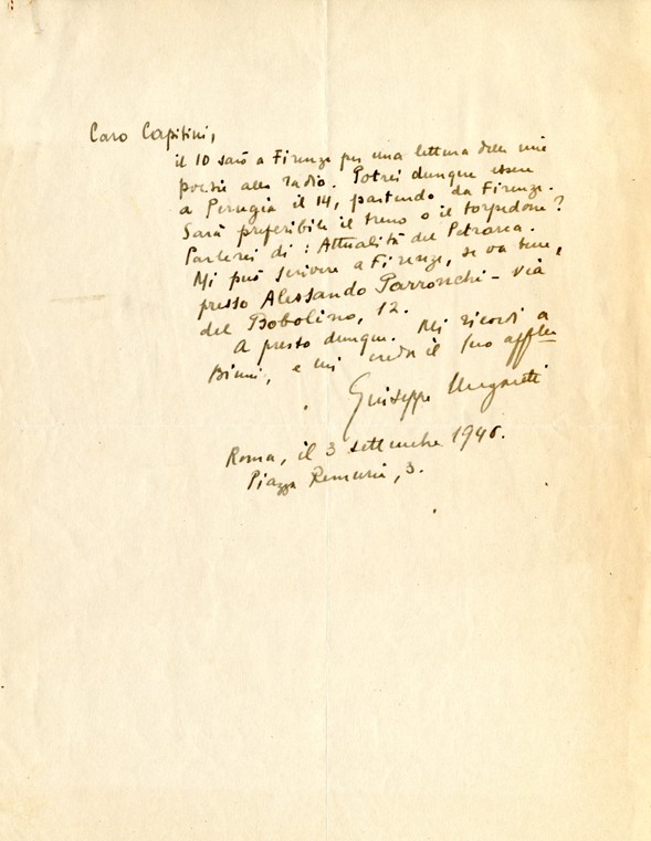 3. Lettera di Giuseppe Ungaretti a Capitini riguardante il modo di venire a Perugia e l’argomento della lezione da tenere all’Università, Roma, 3 settembre 1946