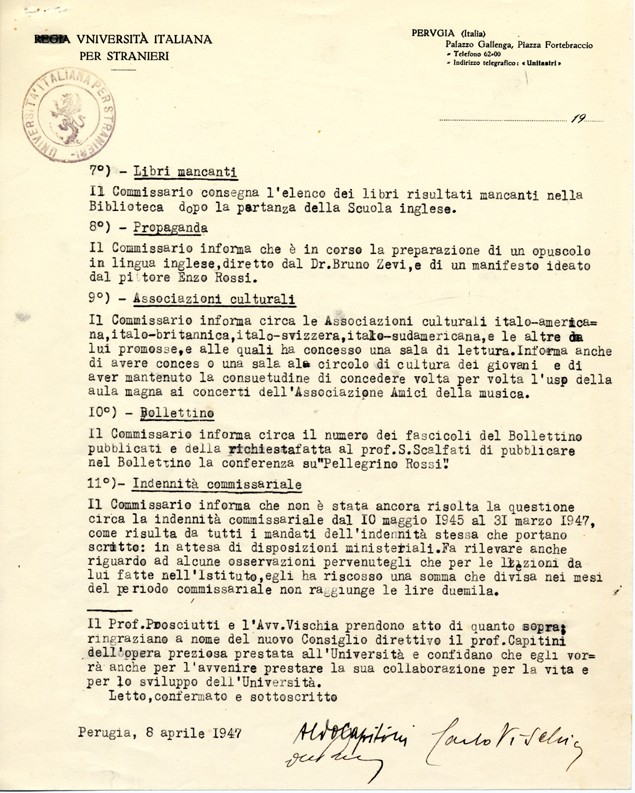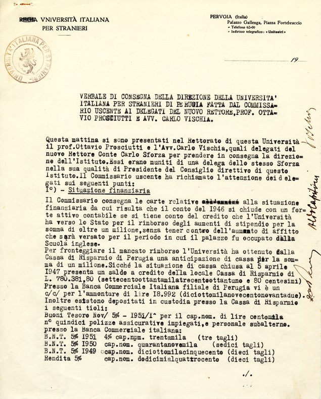 5. “Verbale di consegna della direzione della Università italiana per Stranieri di Perugia fatta da commissario uscente ai delegati del nuovo rettore, prof. Ottavio Prosciutti e avv. Carlo Vischia”, Perugia, 8 aprile 1947 - pag.1, pag.2