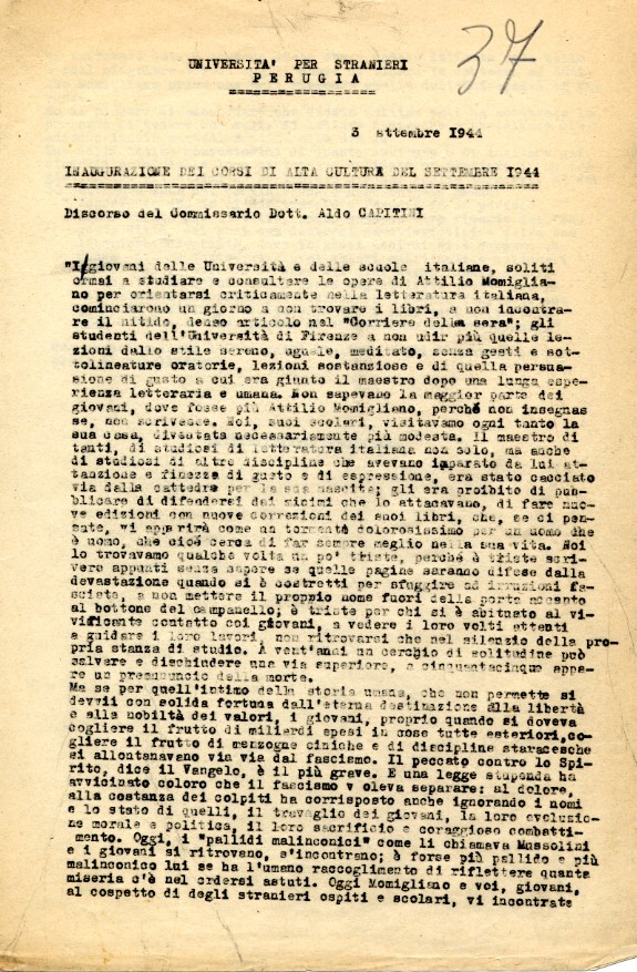 3. Discorso del commissario Aldo Capitini all’inaugurazione dei Corsi di Alta Cultura, 3 settembre 1944 - pag.1, pag.2