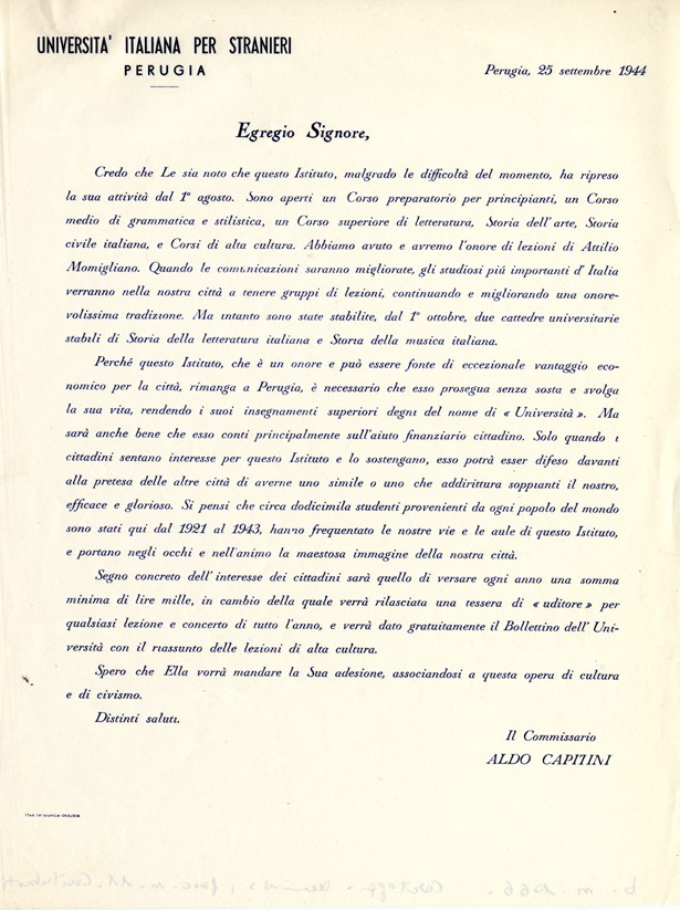 4. Lettera “circolare” del commissario Aldo Capitini per la richiesta di contributi a privati in cambio di tessere di “uditore” per lezioni e concerti, Perugia, 25 settembre 1944