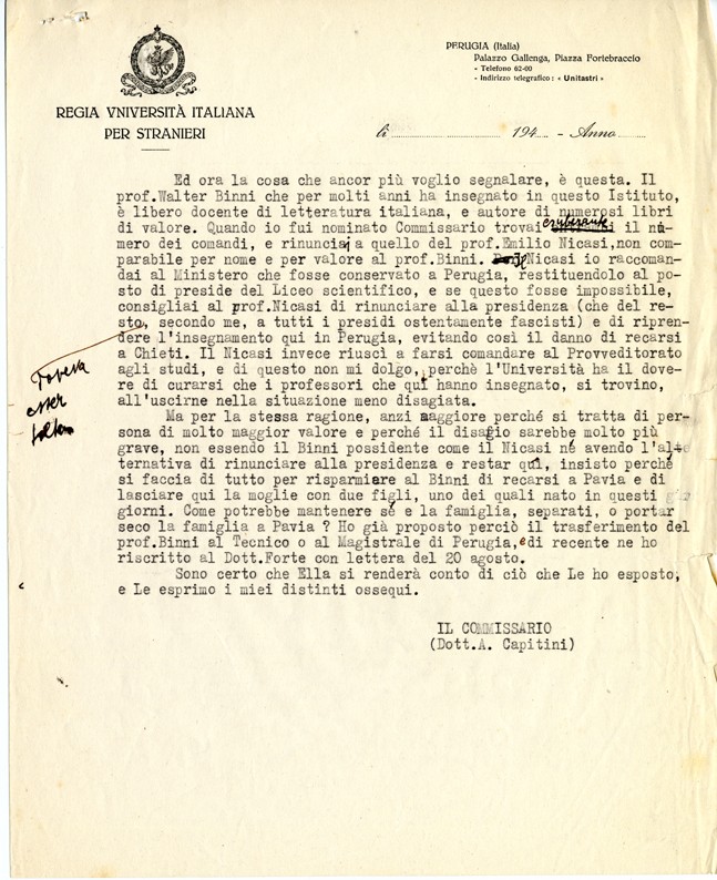 1. Lettera del commissario straordinario Aldo Capitini all’ex rettore Astorre Lupattelli dopo il decreto di nomina, Perugia, 27 luglio 1944