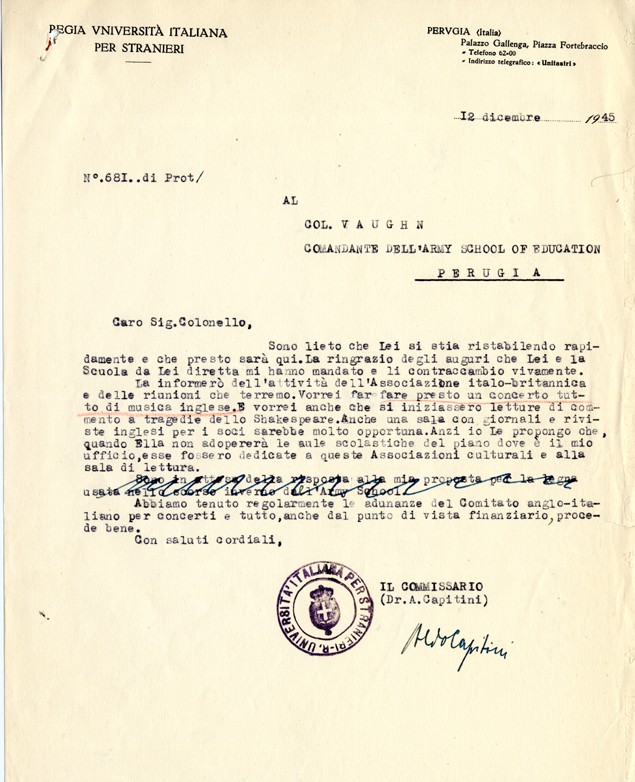 4. Lettera del commissario Aldo Capitini al col. Waughan, comandante dell’Army school of education relativa alle attività svolte all’interno di palazzo Gallenga, Perugia, 12 dicembre 1945